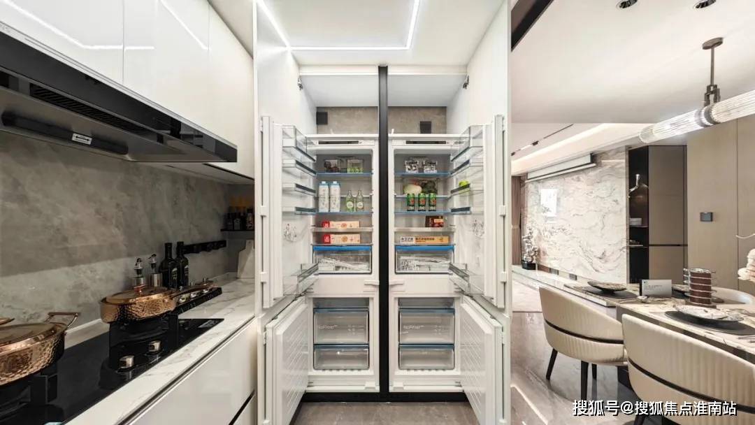 冰箱也是交付标准,还特别配置了轨道插座、前端净水器和凉霸、吊轨金属玻璃移门,既美观又方便清理。