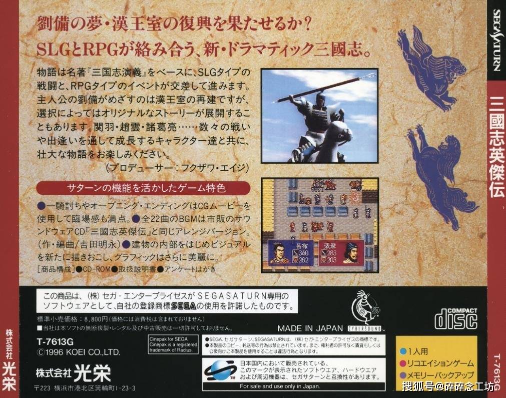 本作最吸引人的就是先后有几十位武将可以选择使用,既有五虎上将、诸葛亮、庞统、姜维、魏延等真实人物,也有虚构的原创角色,玩家可以根据喜好组建培养出征战天下的团队,当年在缺少攻略的环境下,需要反复尝试才能找到最优组合,此外关卡中还有大量宝物可供收集,大量爱好者反复通关只求圆满。土星移植版画面调整为倾斜视角,比起PC原版俯视角立体感更强,同时增加了3D过场动画,Q版造型给人留下了深刻印象,值得一提的是本作也是当年主机上极为罕见的官方中文游戏之一,土星玩家几乎人手一张光盘。