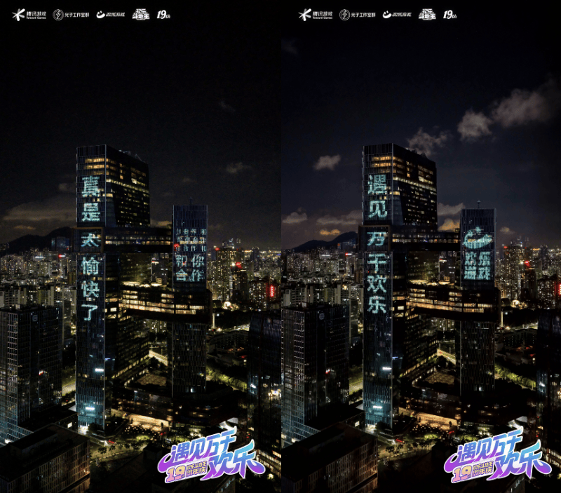 要说最吸睛的,还得是腾讯滨海大厦的“高调官宣”:大厦前摆上了巨型“地主抱欢乐豆”气模,大楼外墙还滚动播放“欢乐斗地主,遇见万千欢乐”以及游戏里的经典“黑话”,引得路人都忍不住停下打卡拍照,仪式感属实拉满!