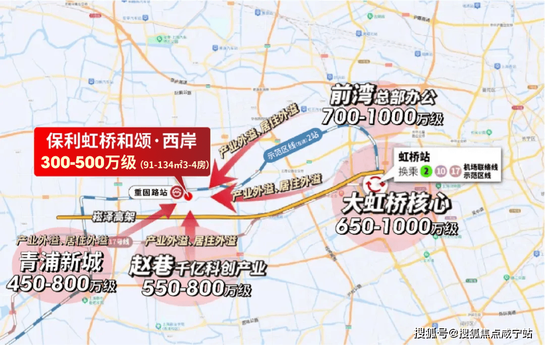 所初中教育用地及多块教育科研用地(规划),未来将形成从幼儿园到初中的全龄优质教育6、超规格性价比:区域价值爆发前夕的置业机遇项目东面2站之隔的前湾、徐泾,房价已达700-1000万级,即便下游的青浦新城,房价也处于450-800万级而保利虹桥和颂·西岸,