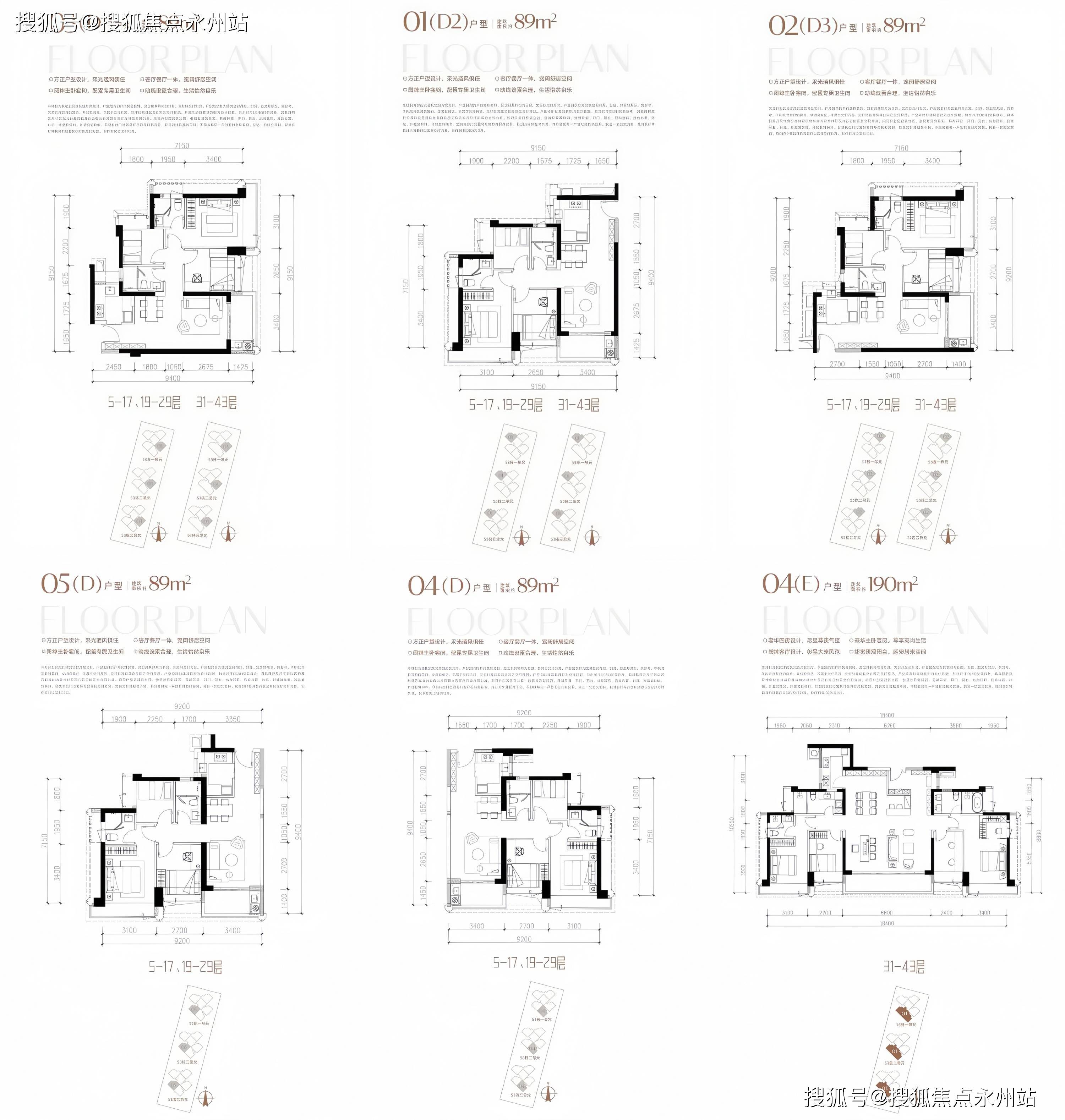 小面积产品,89-190㎡3-4房,楼栋结构均为中低区3T5,高区3T4,高度为43F。户型有约89㎡三房二卫,高区有约190㎡四房三卫,由两个D户型合并而成。