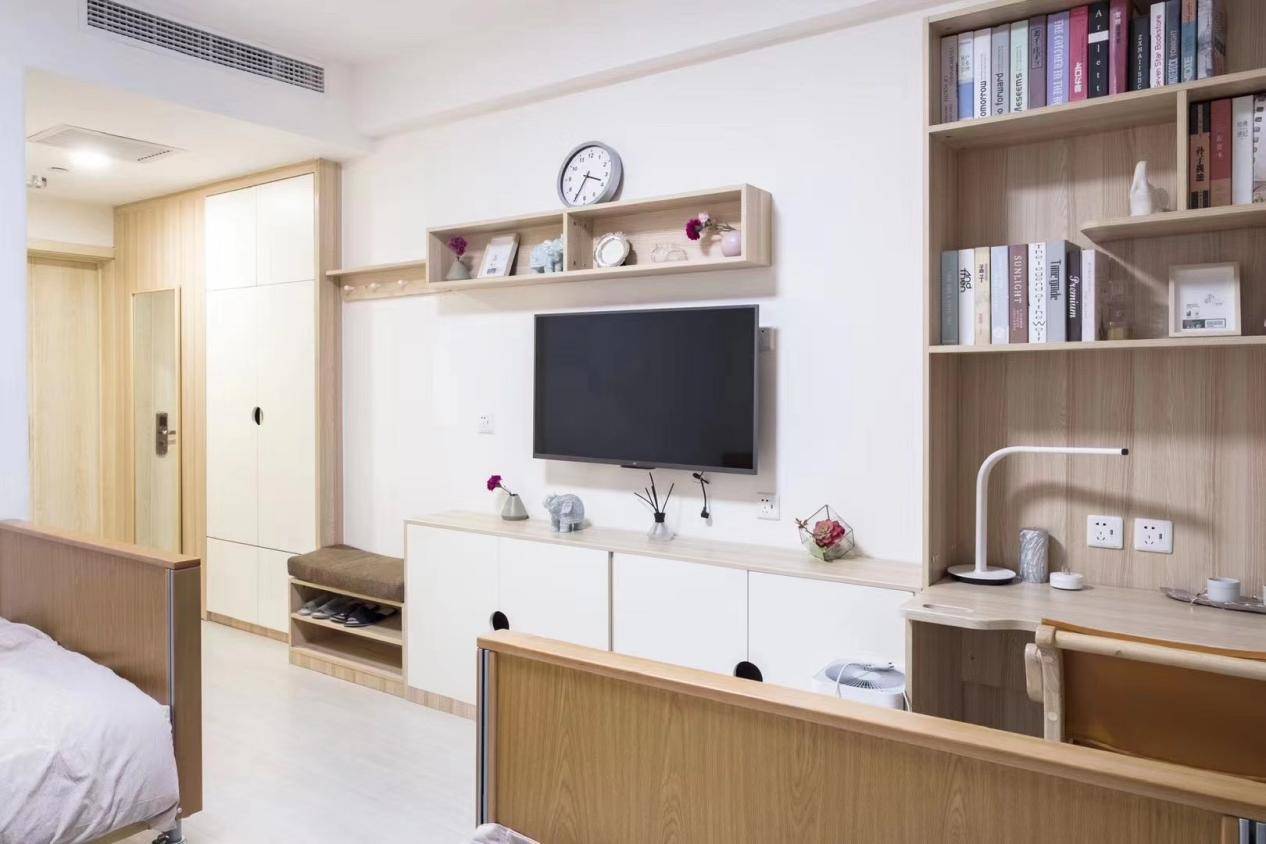北京东燕郊方舟养老院的两栋康养公寓分别命名为平安楼、喜乐楼,寓意着祝愿每一位入住长者平安喜乐、安享晚年,公寓整体按照酒店式标准打造,基础精装修,格调温馨舒适,贴合长者居住习惯。每层拥有独立的多功能大堂、超宽走廊,方便长者轮椅通行,避免拥挤磕碰;公寓采用集中供暖,房间均配备冷暖空调、新风系统,可根据季节变化调节温度,保持室内空气流通,为长者营造舒适的居住环境。房间标配60寸LED平板电视、冰箱、多功能一键呼头、防护型卫生间,细节配置齐全,其中防护型卫生间配备扶手、防滑地面、助浴凳等适老化设施,最大限度保障长者如厕、洗浴安全,一键呼头可快速联系护理人员,及时解决长者各类需求。