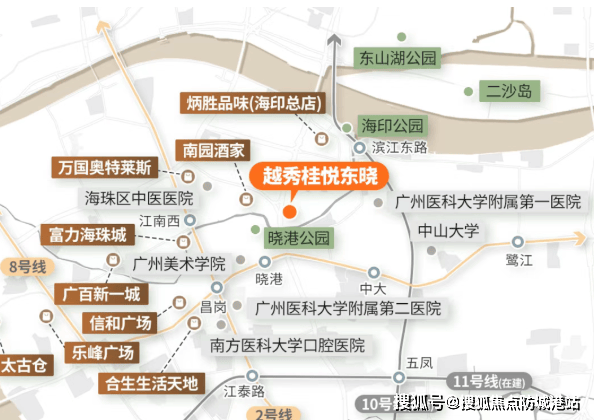 交通网络的发达程度,直接决定了生活的半径。项目周边汇聚了五大城市主干道,无缝串联越秀、天河等核心区域。从项目出发,约8公里范围内(车程约20分钟)即可瞬达珠江新城与琶洲会展中心,让商务精英在繁华与静谧间自由切换。更为令人艳羡的是其“三地铁交汇”的立体交通网:步行约8分钟即达8号线号线号线滨江东路站(在建)。此外,约60米外的海印桥南①公交站,拥有超过20条公交线路,四通八达,畅行全城。无论是日常通勤,还是周末休闲,这里都能提供极致的便捷体验。