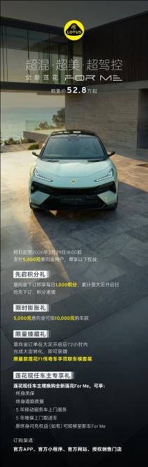2026-03-12棋牌平台,棋牌官网网站,棋牌游戏APP下载日前,莲花汽车宣布,旗下超跑SUV全新莲花For Me正式开启预售。新车推出两个版本,预售价52.8万元起、58.8万元起。发布会上,莲花集团CEO冯擎峰宣布,全新莲花For Me全系标配英伟达Thor顶级算力芯片,可实现高速及城区NOA功能。同时,两款全新车色“绯花橙”与“云釉青”也首次亮相,将随首批莲花For Me车型同步上市。即日起,用户可通过官方App、官网及官方微信小程序下订,支付5000元意向金,转大定后可抵扣10000元购车款;下订之日起至3月29日,每日可领取官方App1000积分,越早下订权益越多。莲花现任车主增购或换购For Me车型,可额外享有终身质保、终身道路救援、5年上门移动服务及5年维保取送车4大专属服务,且现任车主中原有的“终身闪充权益”也可同步转移至新车,具体政策可到店详询。