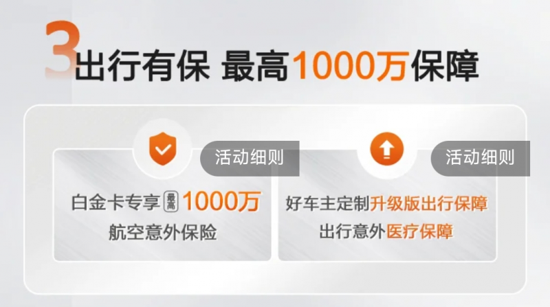 好车主白金卡:同样是用卡买票,延误2小时至高能赔800元一次,而且每月可以赔2次,一年至高赔12次。另外还有至高1000万保额的航空意外保障。
