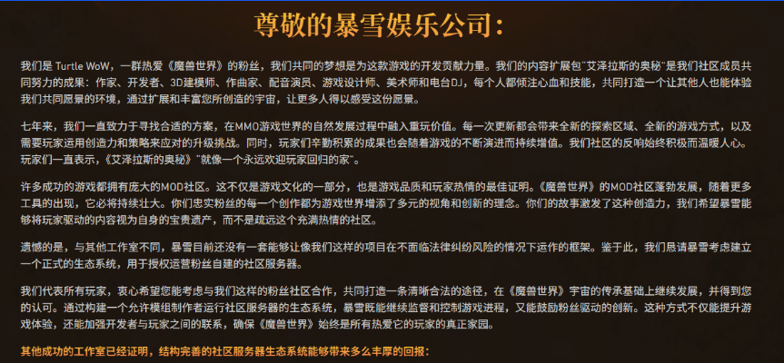 这期间,乌龟服发表过一封给暴雪官方的公开信,大致意思是乌龟服玩家众多,运营组也有技术,有能力,也热爱魔兽,希望能被官方诏安。