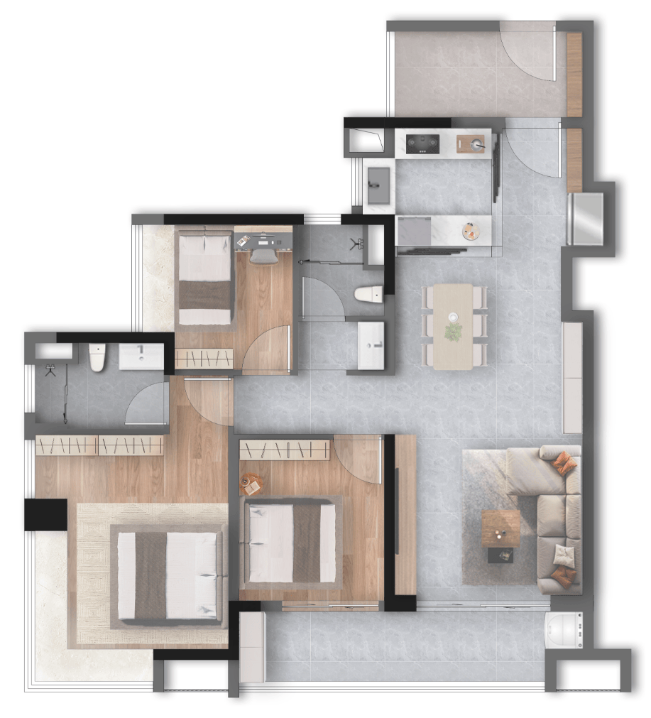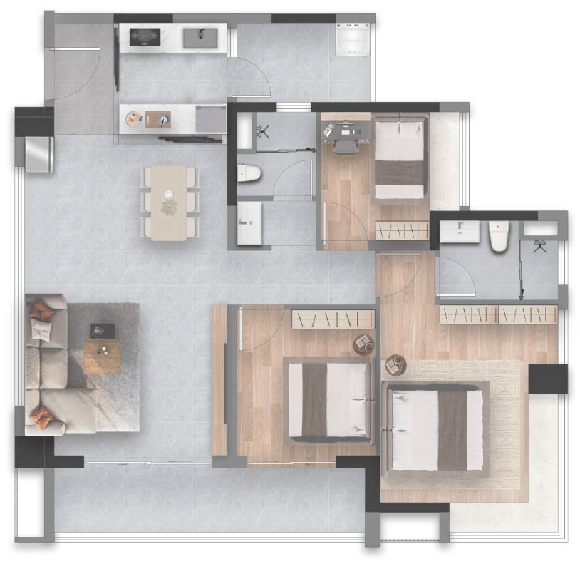 800mm 瓷砖,缝隙更少、更显通透大气,视觉效果更高级;厨房配置全面升级,标配燃气灶、抽油烟机、洗碗机厨电三件套,均为国内一线品牌,品质耐用、操作便捷,同时搭配定制岛台,开放式厨房设计,与餐客厅无缝衔接,打造 LDBK 一体化空间,轻松满足烹饪、聚餐、社交、亲子烘焙等多元生活场景;餐客厅贴心升级分管机分体空调,相比传统中央空调,能耗更低、噪音更小、维护更便捷,四季恒温、舒适宜人,细节之处尽显品质与用心。