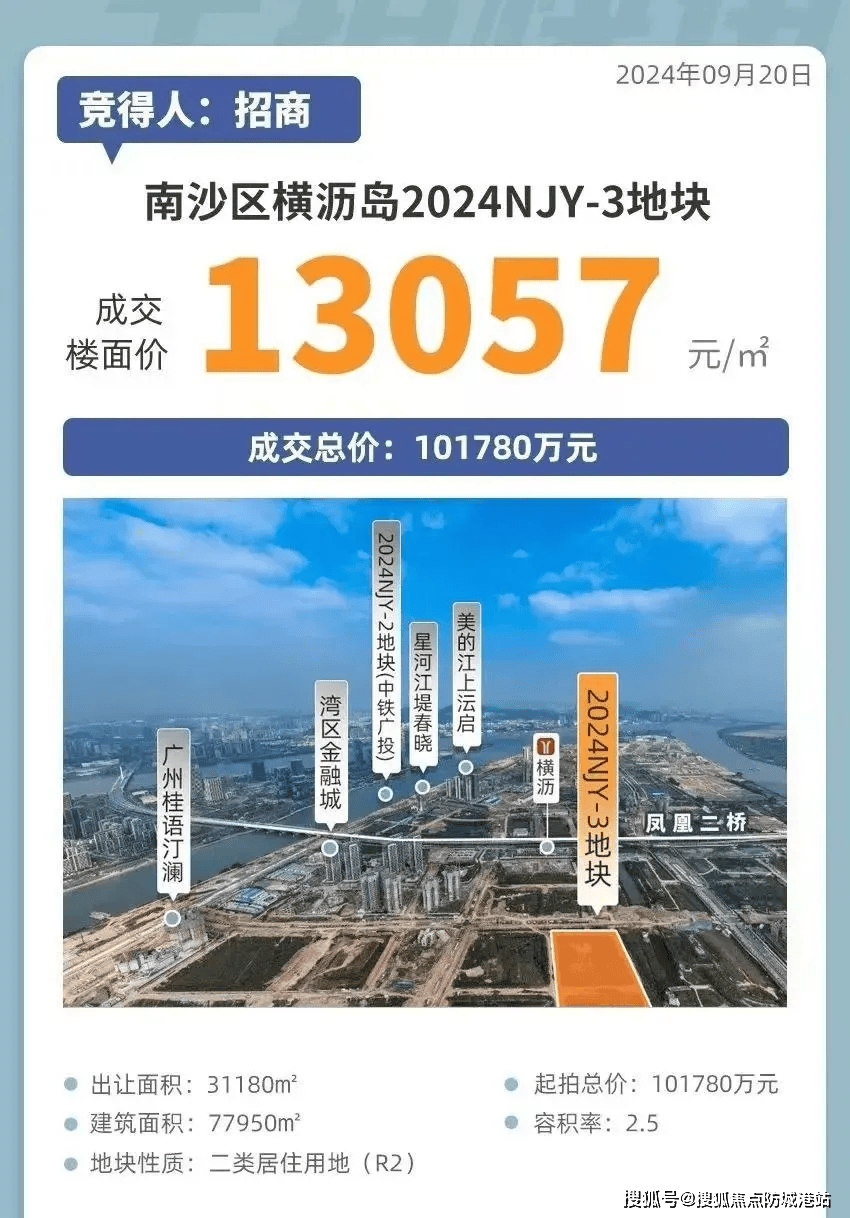 【拿地时间】2024年9月20日,广州招盛房地产有限责任公司(招商蛇口)以底价10.18亿元拿下横沥岛2024NJY-3地块,扣除456㎡配建后,成交楼面价约1.3万/㎡,成为南沙首个“超新规”第四代住宅用地。