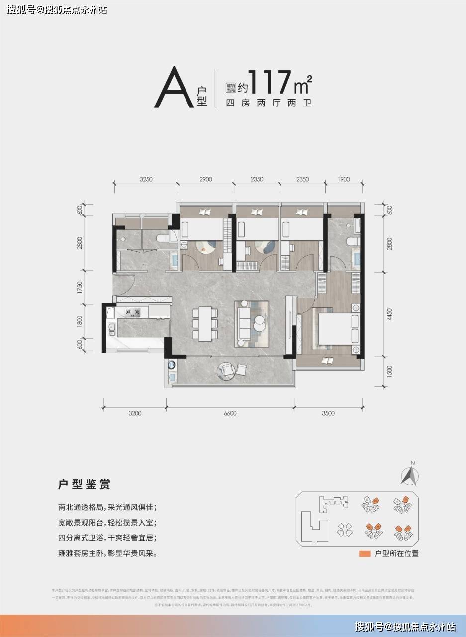 108㎡ 4房2厅2卫:稀缺南北通透4房,约5.9米阔绰阳台,三分离卫生间